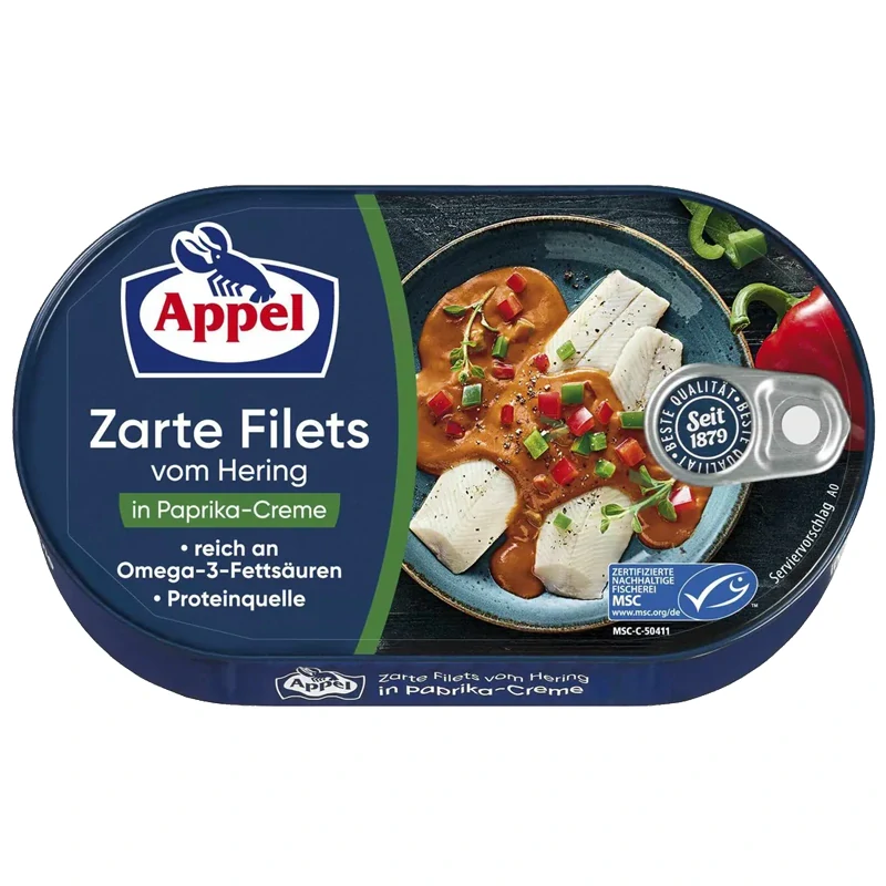 APPEL ZARTE FILETS VOM HERING IN PAPRIKA-CREME - Delikátní jemné filety ze sledě na smetaně s vydatnou paprikou.