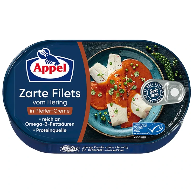APPEL ZARTE FILETS VOM HERING IN PFEFFER-CREME - Jemné filety ze sledě ve slaném, pikantním pepřovém krému.