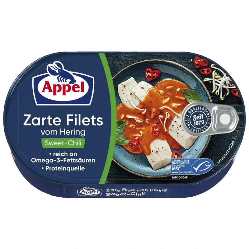 Jemné filety ze sledě od Appelu ve sladké chilli omáčce jsou opravdovou lahůdkou pro všechny milovníky sladkých a pikantních chutí. Zabalené v praktické 200 g plechovce nabízejí dokonalou směs jemných sleďových filet a lahodné sladké chilli omáčky. Tato delikátní rybí specialita je bohatá na omega-3 mastné kyseliny a přirozený zdroj bílkovin, který podporuje vyváženou stravu. Vychutnejte si jemné filety ze sledě se sladkým chilli jako lahodný předkrm, na salátech nebo jako hlavní chod a zažijte nesrovnatelnou chuť, která vás potěší.