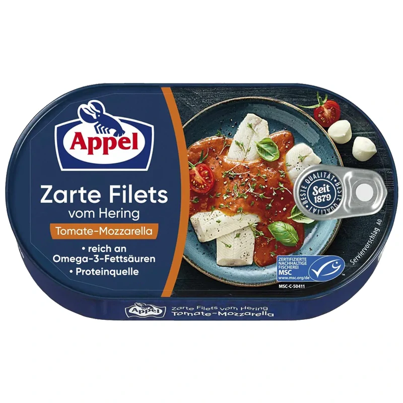 APPEL ZARTE FILETS VOM HERING TOMATE-MOZZARELLA - Jemné filety ze sledě v aromatické rajčatovo-mozzarellové omáčce rafinované bazalkou.