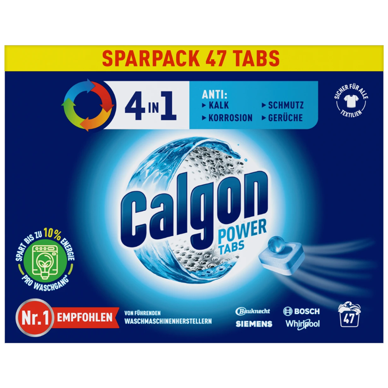 - Calgon 4 in 1 Power Tabs bojují proti vodnímu kameni a chrání komponenty, jako jsou topná tělesa, hadice nebo buben pračky před poškozením.