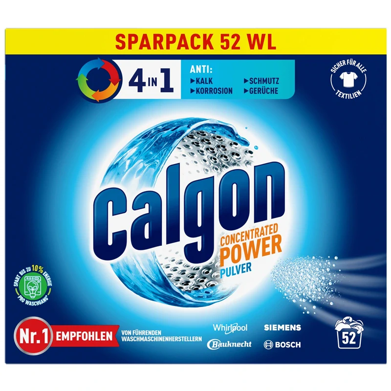 - Calgon 4 in 1 Concentrated Power Pulver bojuje proti vodnímu kameni a chrání komponenty, jako jsou topná tělesa, hadice nebo buben pračky před poškozením.