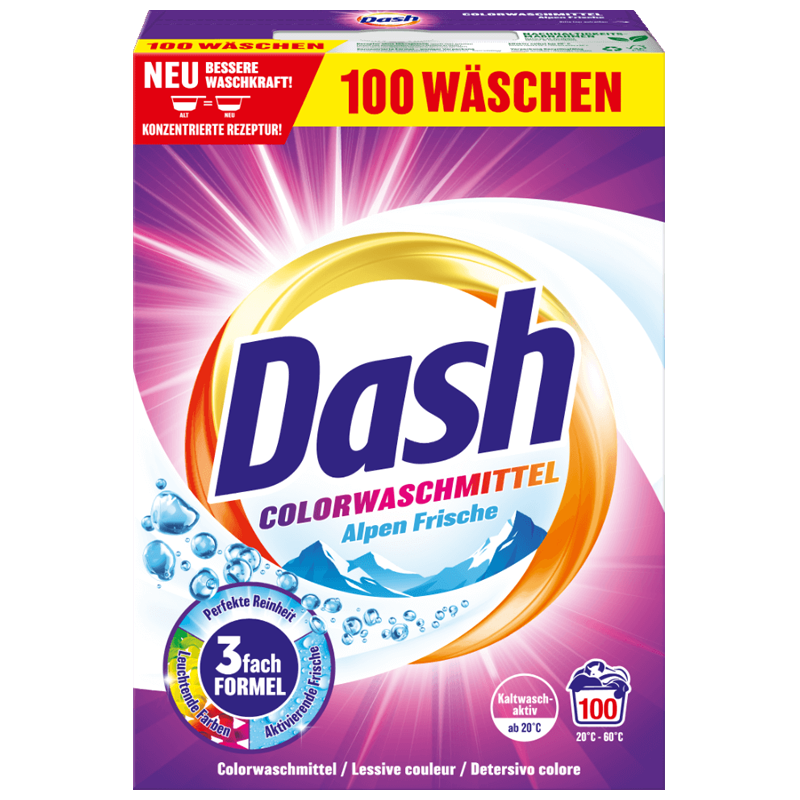 Dash prací prášek je ideální prací prostředek pro rodiny. Dash COLORWASCHMITTEL ALPEN FRISCHE zajišťuje všestranný čistý výsledek díky své povzbuzující, zářivé svěžesti. Svítivost barevného prádla je zachována i po mnoha praních a je aktivně chráněna proti zašednutí a přenosu barev. Skvrny jsou spolehlivě odstraněny již při prvním praní. Díky tomu je Dash Colorwaschmittel Alpen Frische vhodným pracím prostředkem na barevné prádlo pro každého, kdo miluje barvy. Vnímejte a užívejte si povzbuzující svěžest Dash. Povzbuzující, zářivá svěžest pro všestranně čistý výsledek. Pro hloubkovou čistotu a svěžest vláken. Skvrny jsou spolehlivě odstraněny již při prvním praní. Aktivní praní od 20 °C, což šetří energii a chrání životní prostředí. Nevhodné pro praní vlny a hedvábí. Z důvodu zamezení plýtvání nepřidáváme dávkovací odměrku.