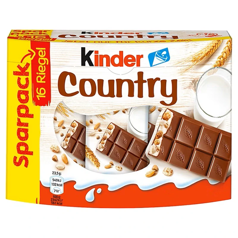 To nejlepší ze země. Kinder Country jsou vždy lahůdkou. Pět lehce pražených obilovin ječmene, rýže, pšenice, špaldy a pohanky - v lahodné mléčné náplni, zalité jemnou mléčnou čokoládou - dodává tyčince její nezaměnitelnou chuť. Vznikne tak jedinečná čokoládová pochoutka, která chutná nejen nádherně křupavě, ale také krémově.