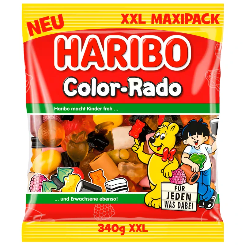 Color-Rado je nejoblíbenější a nejrozmanitější směs v barevné řadě HARIBO: Kromě lahodného ovocného želé, kořeněné lékořicí a klasických cukrovinek najdou v barevné směsi své místo také oblíbené růžové maliny. S HARIBO Color-Rado je pro každého něco! Sáček o hmotnosti 340 g je Color-Rado ideální pro mlsání s rodinou a přáteli.
