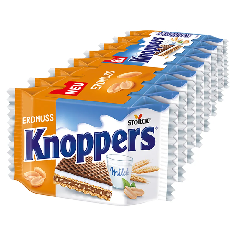 8 jednotlivě balených křupavých oplatek. Ideální pro sdílení pro všechny fanoušky arašídů, kteří chtějí prožít den plný křupání. Čas na něco nového! Protože snídaňová klasika Knoppers je nyní k dispozici také s lahodnými arašídy. Nugátový krém je nahrazen jemným arašídovým krémem a kousky lískových oříšků jsou doplněny lehce slanými kousky arašídů. Vyvážená kombinace, která chutná nádherně svěže a lahodně – jako pauza nebo svačina. Ať už jste doma nebo na cestách, ve skupině nebo sami – Knoppers se vždy hodí.