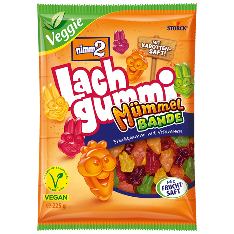 Pro všechny milovníky vegetariánství je nyní Nimm2 Lachgummi k dispozici také se zeleninovo-ovocnou šťávou! V Nimm2 Lachgummi MümmelBande je šest lahodných kombinací zeleniny a ovoce pro spoustu zábavy při občerstvení.