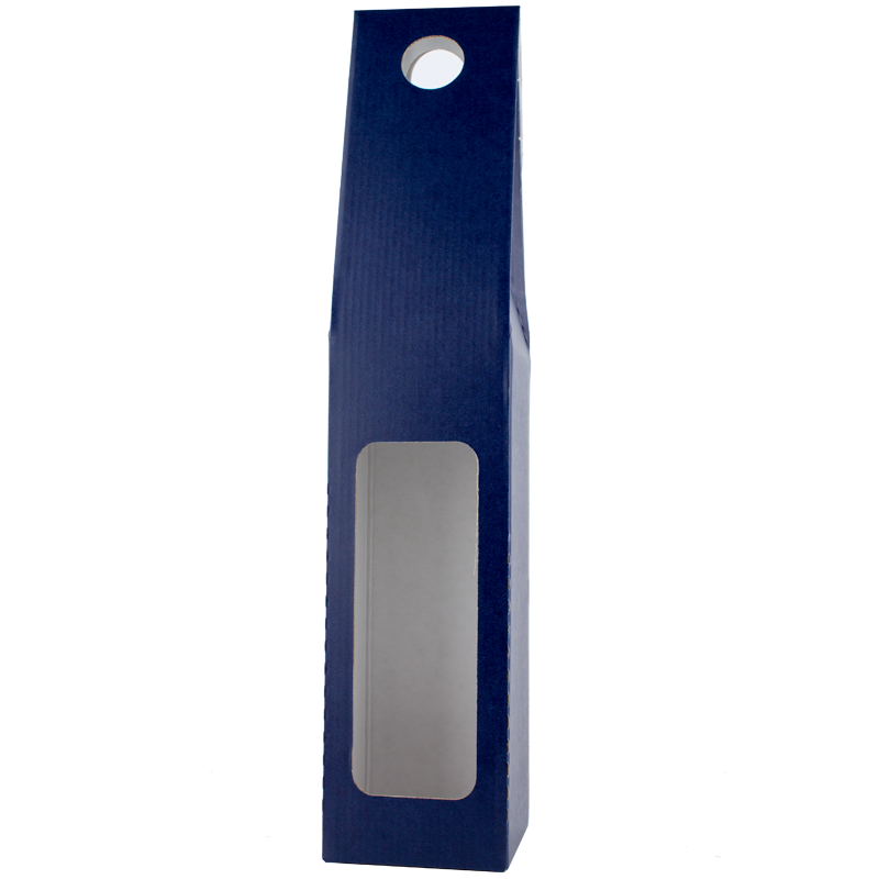 Obal na 1 láhev vína 0,75 l z třívrstvé vlnité lepenky - barva modrá. Dárkový obal s okénkem, umožňujícím náhled na etiketu láhve.