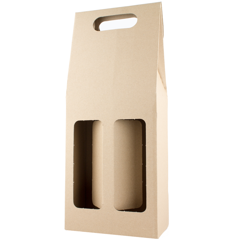 Obal na 2 láhve vína 0,75 l z třívrstvé vlnité lepenky bez potisku s uchem - barva přírodní hnědá. Dárkový obal s okénkem, umožňujícím náhled na etiketu láhve.