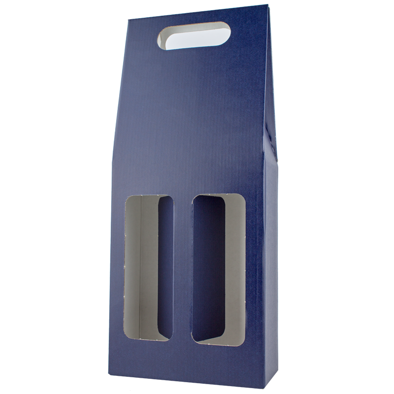 Obal na 2 láhve vína 0,75 l z třívrstvé vlnité lepenky - barva modrá. Dárkový obal s okénkem, umožňujícím náhled na etiketu láhve.