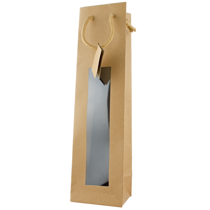 Papírová taška na 1 láhev vína 0,75 l se zafóliovaným okénkem a textilním uchem - barva hnědá. Luxusní dárková taška na víno v přírodním designu. Taška je opatřena pevným uchem pro snadné nošení a kartičkou kam můžete napsat jméno nebo krátké věnování.