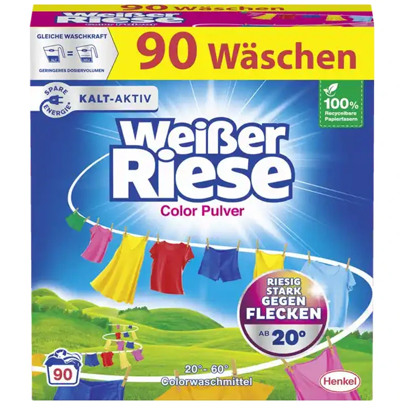 Weißer Riese Color prací prášek je ideální prací prostředek pro rodiny. Díky své prací síle je extra silný proti skvrnám a je účinný již od 20°C. S nejlepší obří silou svěžesti zajišťuje zářivě čisté barevné prádlo se svěží vůní. Díky vylepšené parfémové technologii si nyní můžete užívat intenzivní, dlouhotrvající svěží sílu. Weißer Riese je šetrný k životnímu prostředí díky nízké spotřebě energie a vody na jedno praní. Užijte si příjemnou, dlouhotrvající vůni a zářivě čisté prádlo. Obsahuje inteligentní recepturu s výkonnou kombinací přísad, která rozpozná a účinně ošetří více než 100 druhů skvrn, již od 20°C